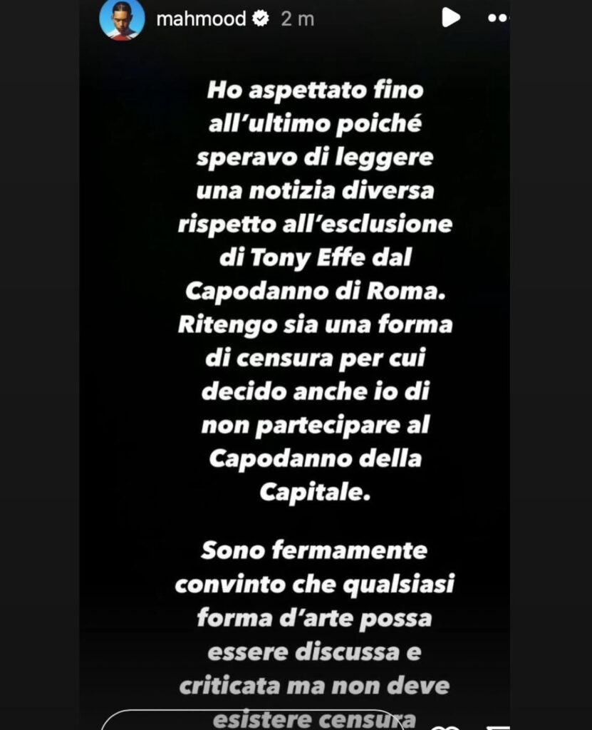 Oggi le cose si sono ribaltate! Dopo che il Comune di Roma qualche giorno fa ha deciso di stoppare la partecipazione di TonyEffe al concertone di Capodanno a causa dei testi delle sue canzoni (…pensarci prima di invitarlo e fare comunicazione? no?), oggi dopo che molti artisti si sono schierati a favore del cantante inneggiando alla censura, Mahmood e Mara Sattei hanno deciso di non partecipare all’evento.